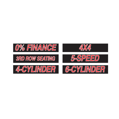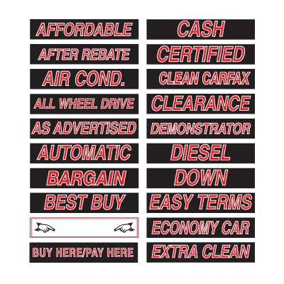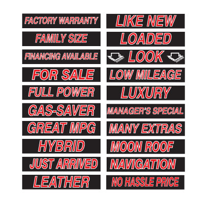 15" adhesive windshield slogans in Red/Black/White. Durable, waterproof vinyl with removable adhesive. Sized about 15" x 2¾" so they stack neatly above or below price digits.
