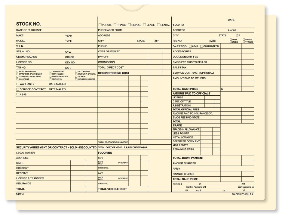 The ultimate organizational tool. This jacket has a detailed form printed on the outside to track costs, commissions, and vehicle info.