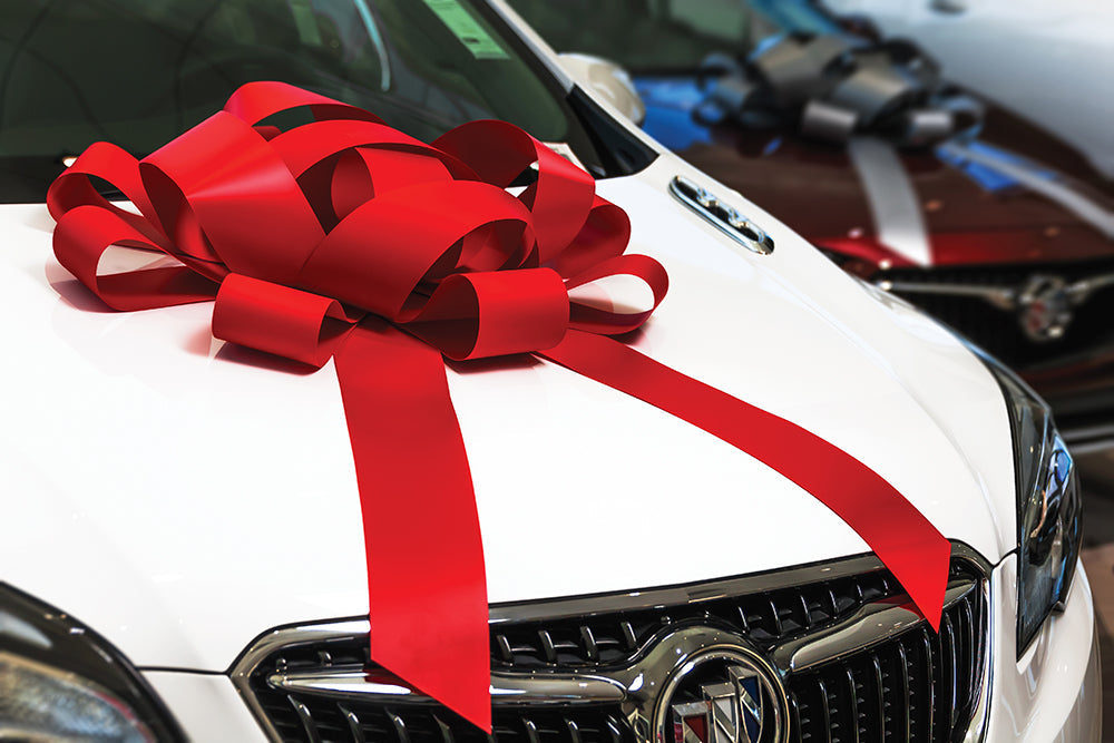 Giant 30" high‑visibility magnetic showroom bow. Weather‑resistant ribbon and long tails make every delivery feel special on the floor or the front line.