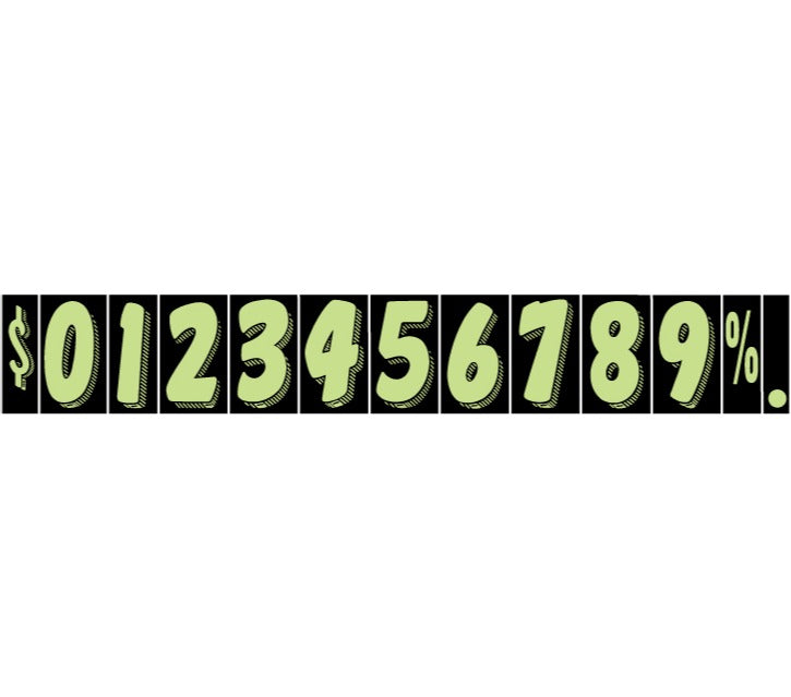 7½″ Neon Green adhesive windshield numbers made for clean pricing on sedans, crossovers and small SUVs. Removable adhesive peels clean when you reprice; bold shading photographs well for online listings.Angie's Pro Tip: Use Neon Green digits on vehicles parked farthest from the road so the price still carries in drive‑by traffic.