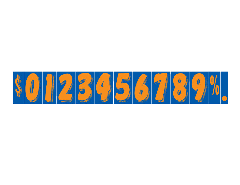 7½″ Fluorescent Orange & Blue adhesive windshield numbers made for clean pricing on sedans, crossovers and small SUVs. Removable adhesive peels clean when you reprice; bold shading photographs well for online listings.Angie's Pro Tip: Use Fluorescent Orange & Blue digits on vehicles parked farthest from the road so the price still carries in drive‑by traffic.