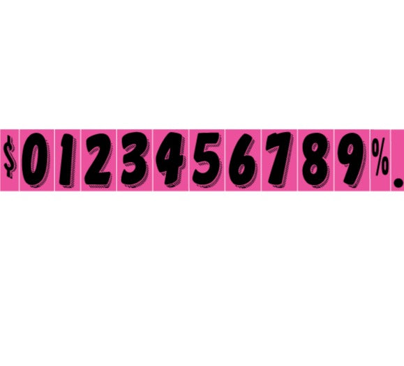7½″ Hot Pink adhesive windshield numbers made for clean pricing on sedans, crossovers and small SUVs. Removable adhesive peels clean when you reprice; bold shading photographs well for online listings.Angie's Pro Tip: Use Hot Pink digits on vehicles parked farthest from the road so the price still carries in drive‑by traffic.