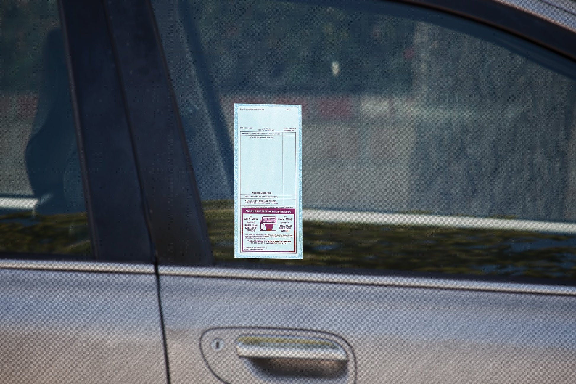Medium‑size addendum stickers with clean adhesive for inside‑glass posting. Pre‑ruled sections for equipment, recon, protection packages and supplemental dealer pricing to keep your offer transparent and compliant.