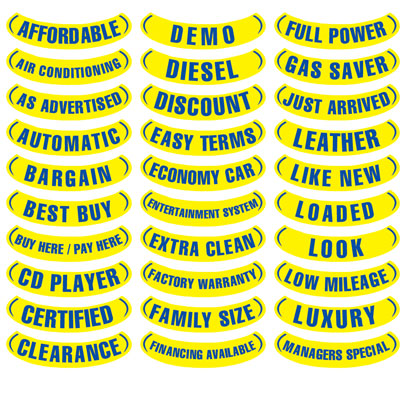 Designed to complete your windshield's value story, these reverse arch slogans are the perfect finishing touch. The unique shape is made to fit perfectly underneath our popular Oval Year Model Signs, creating a clean, layered, and professional look. The high-impact blue-on-yellow color scheme ensures your key selling points are easy to read, helping you build a complete dealership merchandising message right on the glass.