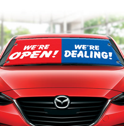 Designed as the smartest, fastest way to make a huge statement on your frontline, these windshield banners for cars use a unique elastic cord system that attaches to the side mirrors in seconds. This creates a huge, taut advertising space without any messy adhesive. Made from heavy-duty, weatherized vinyl, these dealership banners not only shout your message but also act as a sunshade, keeping the vehicle's interior cooler for test drives. It's the ultimate reusable, high-impact tool for professional frontline advertising.