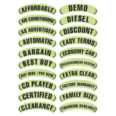 Designed to give your merchandising a modern, high-visibility edge, these fluorescent arch slogans create a stunning, high-contrast display. The electric chartreuse background and bold black text are a powerful combination for maximum readability on the frontline. Made to fit perfectly with our Oval Year Model Signs, these chartreuse windshield decals allow you to "stack" key selling points in a clean, curved design, creating a contemporary and effective merchandising strategy.