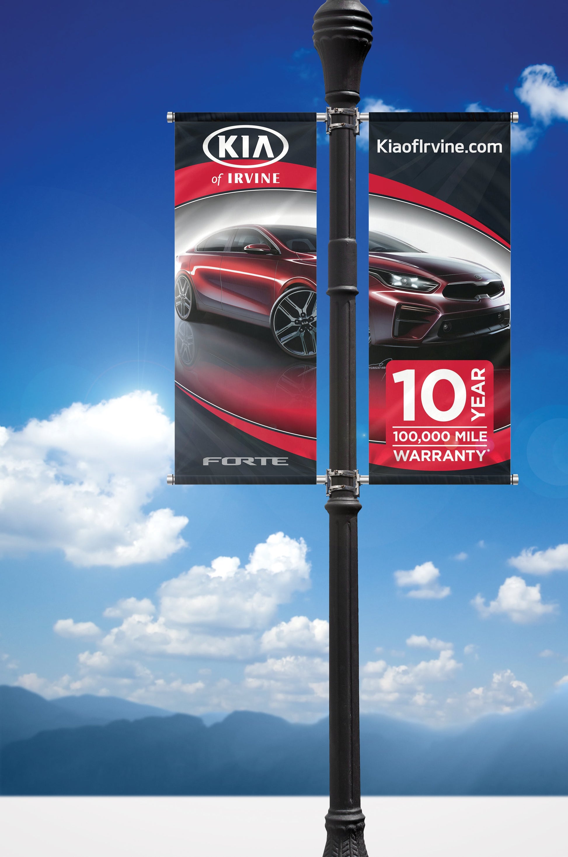 Complete double‑pole street banner kit (3.5' x 7.5'), printed double‑sided for curb visibility in both directions. Includes two fiberglass arms, cast‑aluminum brackets, and stainless straps that flex in wind to keep prints tight.