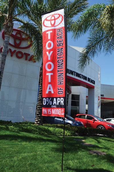 Custom Single Sided Flat Top Flag® built on durable polyester with a reinforced sleeve for daily lot use. High‑saturation dye‑sub graphics read crisp from both sides. Ground spike anchors cleanly in soil; spindle lets the flag rotate with wind.