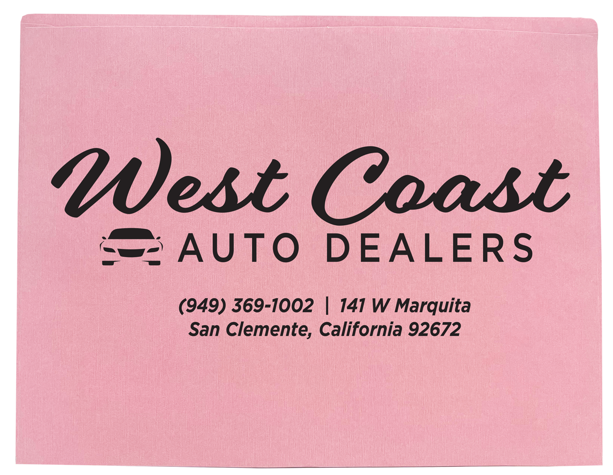 Custom vehicle records envelopes (deal jackets), 100/pk. Heavy stock with your logo and pre‑printed fields for appraisal, recon, payoff and F&I notes.