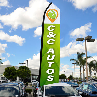 Custom single sided swooper flag kit with Tire Base. Tall, high‑visibility flag with poles and base hardware; double‑sided includes a blackout liner so copy reads correctly both ways.