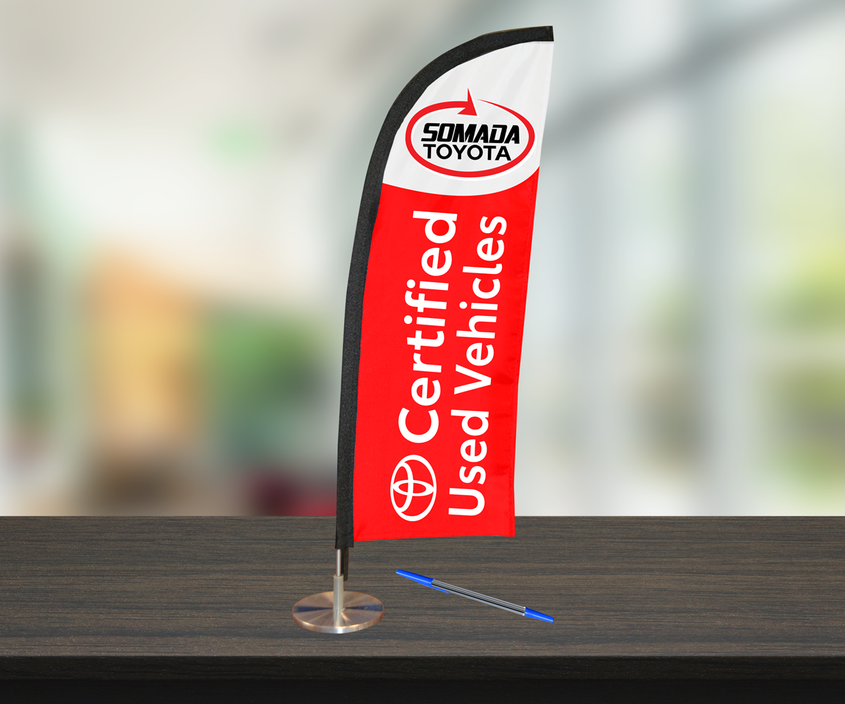 Decorate your desks, counters, and tables with these vibrant Feather style flags! Flag size is 16" x 8.5". Durable stretch polyester. Easily change only the flag to feature a new design or promotion. Double sided. Light-weight with solid aluminum base. Two flag kit minimum. Bright full color custom design.
