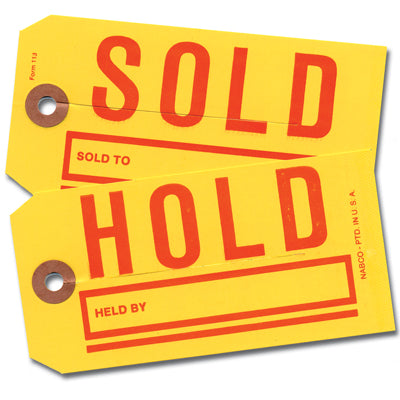 Jumbo HOLD/SOLD tags (250/box) with bold print and write‑in fields for customer name, delivery date, and notes. Large format reads from across the line so the whole team stays aligned.
