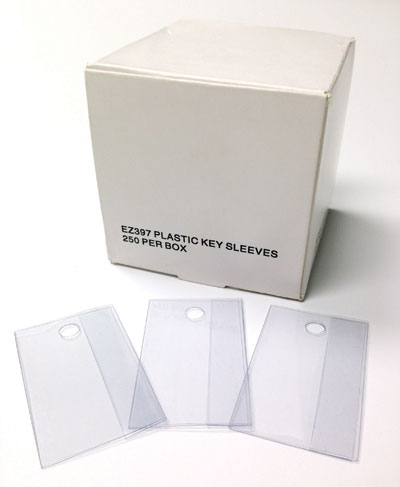 Clear plastic key sleeves (250/box) that protect write‑on tags from oil and weather. Fits standard dealer key tags and rings.