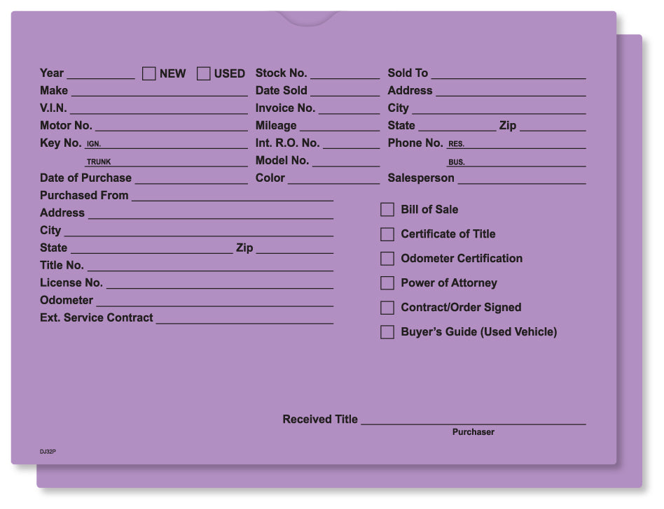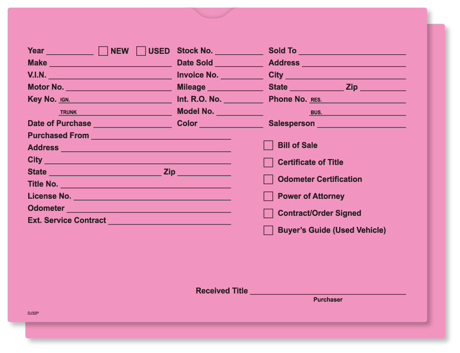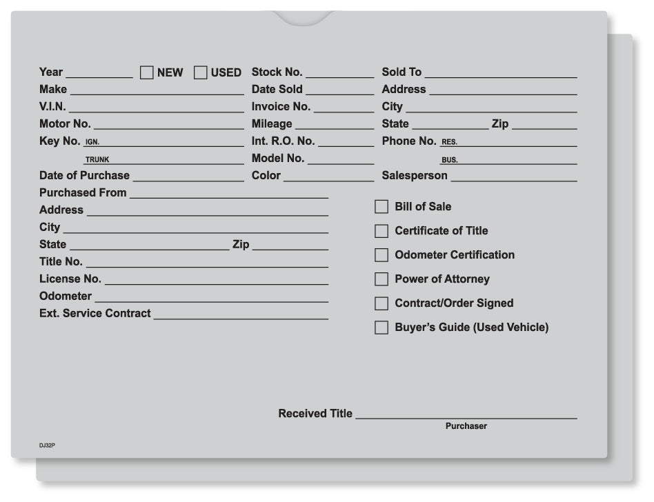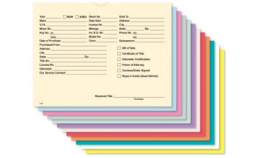 Keep every car deal organized and professional with these heavy-duty deal jackets. Made from durable 32 lb. stock paper, they are built to withstand heavy use without tearing. The pre-printed form on the front provides space for all critical customer and vehicle information, ensuring your sales and F&I team never misses a detail. Comes in a package of 500.<br><br><strong>Angie's Pro Tip:</strong> One method I've used is a color-coded system that saves countless headaches. Use one color of deal jacket for standard used car deals, another for reconstructed titles, and a third for wholesale. At a glance, anyone in the office can identify the type of deal it is without opening it, which streamlines the handoff from sales to finance.