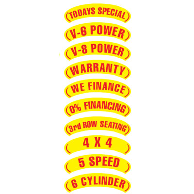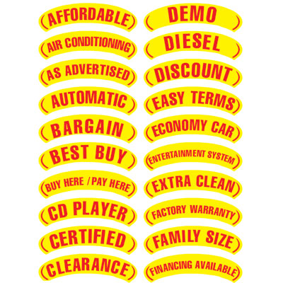 Designed as the perfect complement to your pricing system, these arch slogan decals create a complete, professional look on the windshield. Made to fit perfectly above or below our Oval Year Model Signs, these windshield slogan stickers allow you to "stack" key value statements like "Certified" or "Low Miles" in a clean, curved design. The bright red-on-yellow color scheme grabs attention, while the high-quality, weatherproof vinyl and clean-peel adhesive ensure your dealership merchandising always looks top-notch.