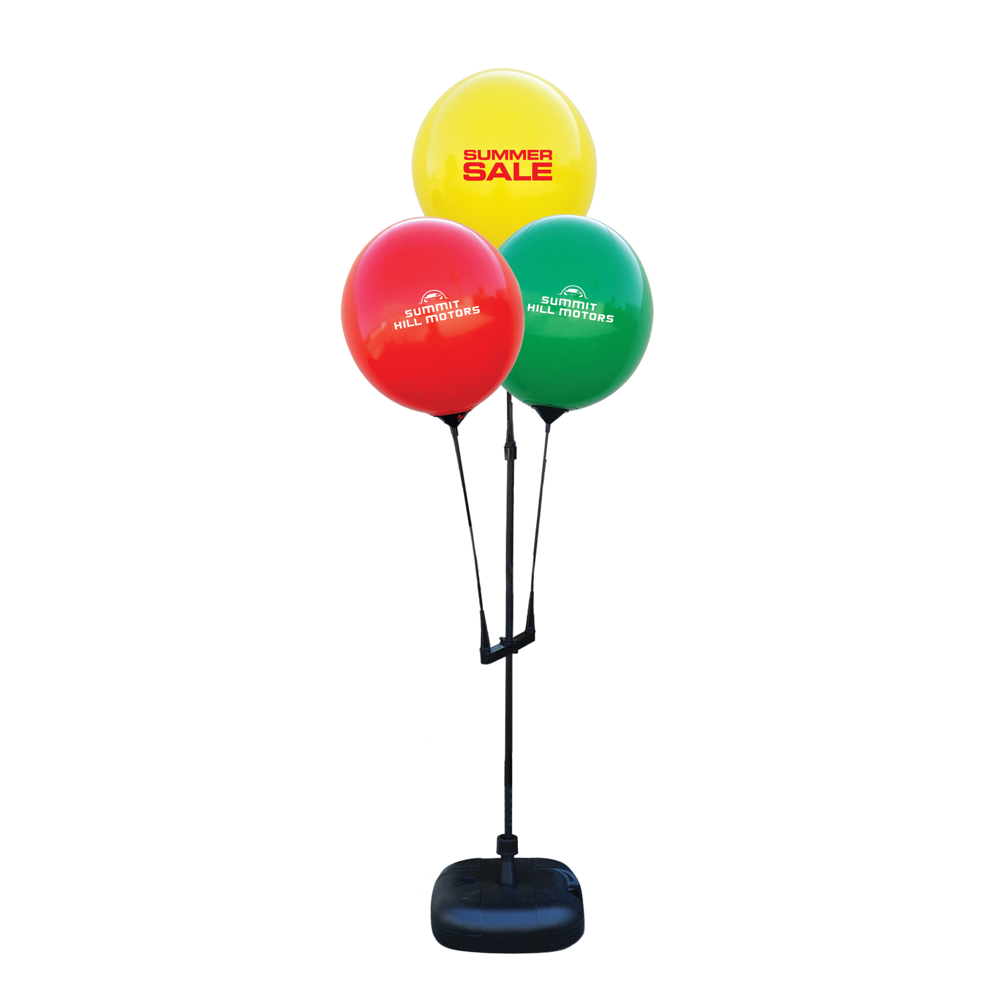 Reusable Balloon Cluster Kit with Ground Spike — Three Balloons. Grouped balloons at staggered heights create motion that pulls eyes from the road. Reusable shells hold shape for weeks.