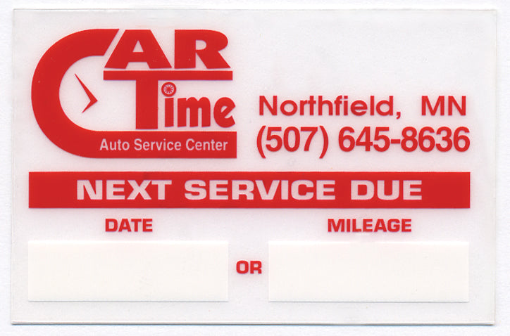 Static‑cling ‘Service Due’ stickers with write‑in fields. Clings inside glass without adhesive and peels clean at the next visit.