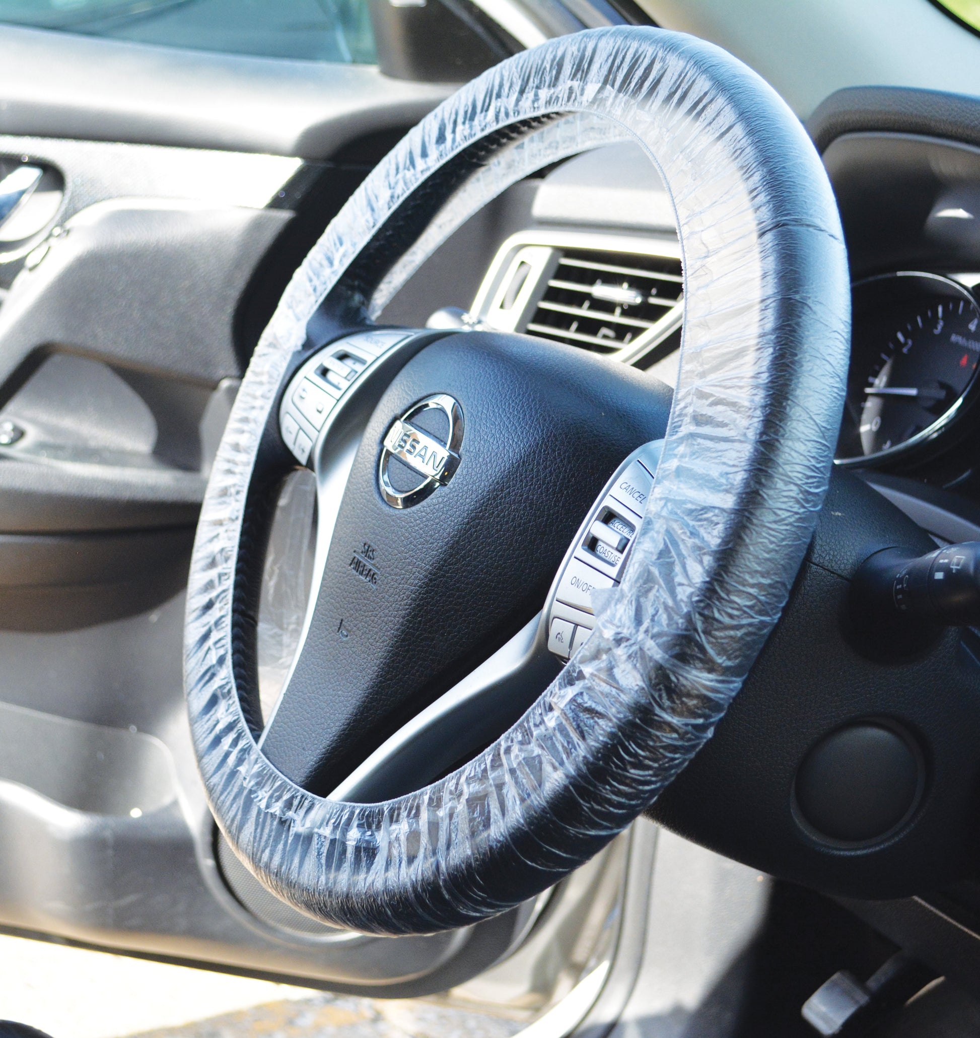 Disposable steering wheel covers (100/pk) for service and recon. Keeps interiors clean through make‑ready and test drives.