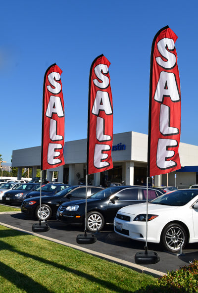 Swooper flag & pole kit with water base. Tall, high‑visibility flag with segmented pole; base options fit turf or asphalt for daily lot use.