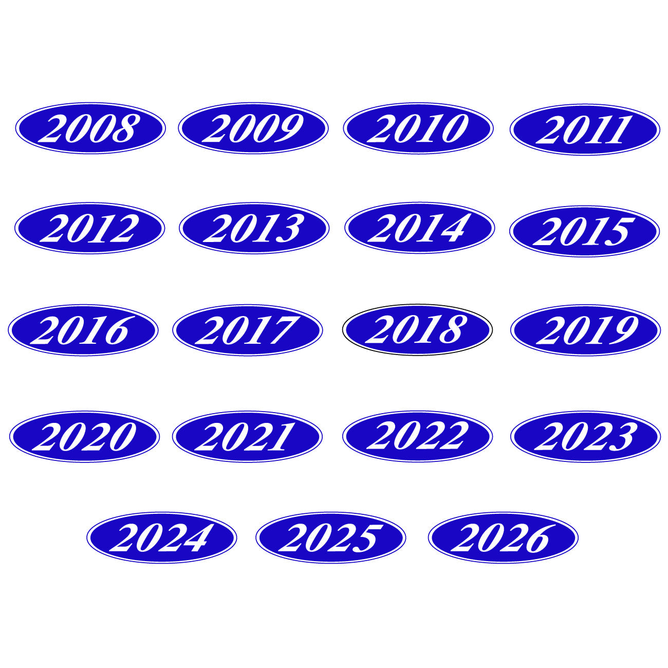 White & Blue E‑Z Oval year‑model signs. Removable adhesive stacks neatly above or below your price for a clean, organized look.