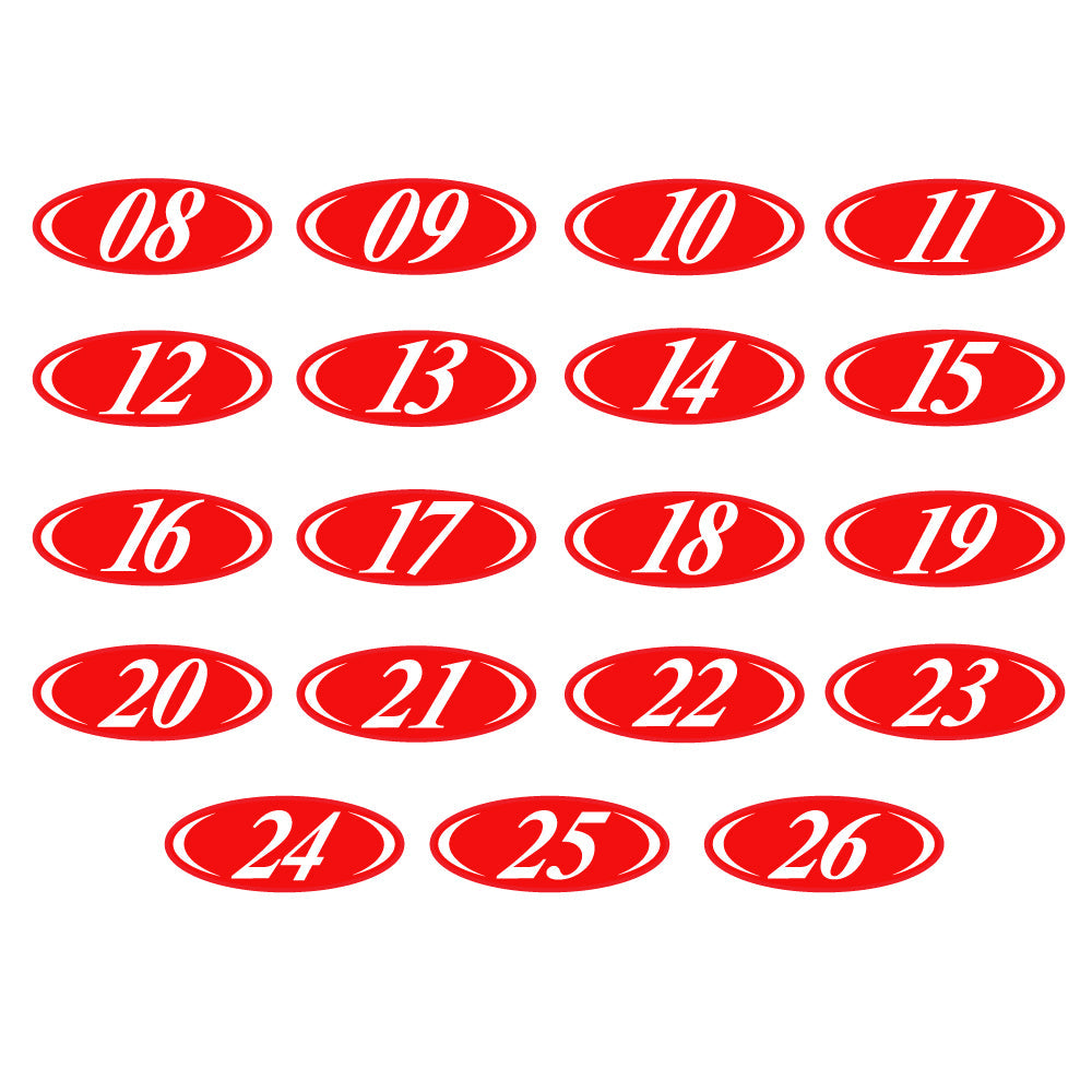 White & Red two‑digit oval year‑model signs sized for small windshields and side glass.