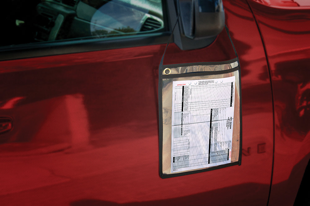 Clear work order holders (25/pk) with write‑on face and reinforced edges. Protects ROs, estimates, and tech notes from grease and weather as cars move between recon, photos, and delivery.