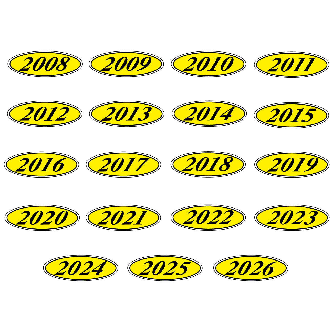 Yellow & Black E‑Z oval year‑model signs. Clean die‑cut ovals stack neatly above or below your price digits; removable adhesive peels clean when the car sells.